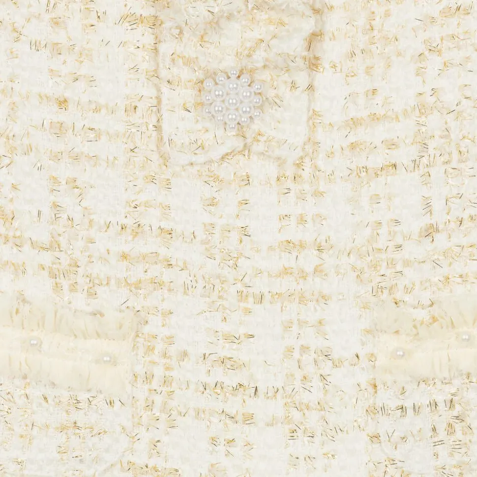 Super smart ivory tweed dress for girls by Portuguese brand Patachou, sparkling with glittery gold thread. In a classic style, it has a rounded collar, ruffled front detailing with clusters of pearl beads and front patch pockets trimmed in chiffon and pearls. Soft and mid-weight, the skirt is flared and there is a discreet, concealed zip fastening on the back. The dress is fully lined in cotton voile for comfort.