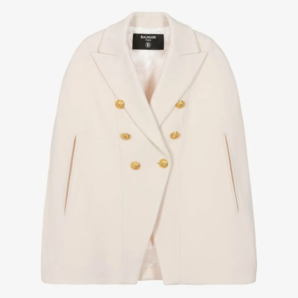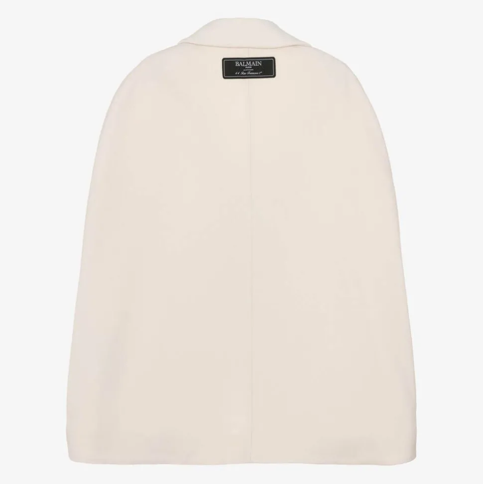 A smart ivory cape for girls by luxury French fashion house Balmain, made in a luxurious blend of wool and cashmere. With a soft felted feel, this double-breasted design is styled with notched lapels and lined with branded satin for ultimate comfort. Shiny gold medallion buttons add an elegant touch and for a signature look, the designer's black logo label can be seen on the back.