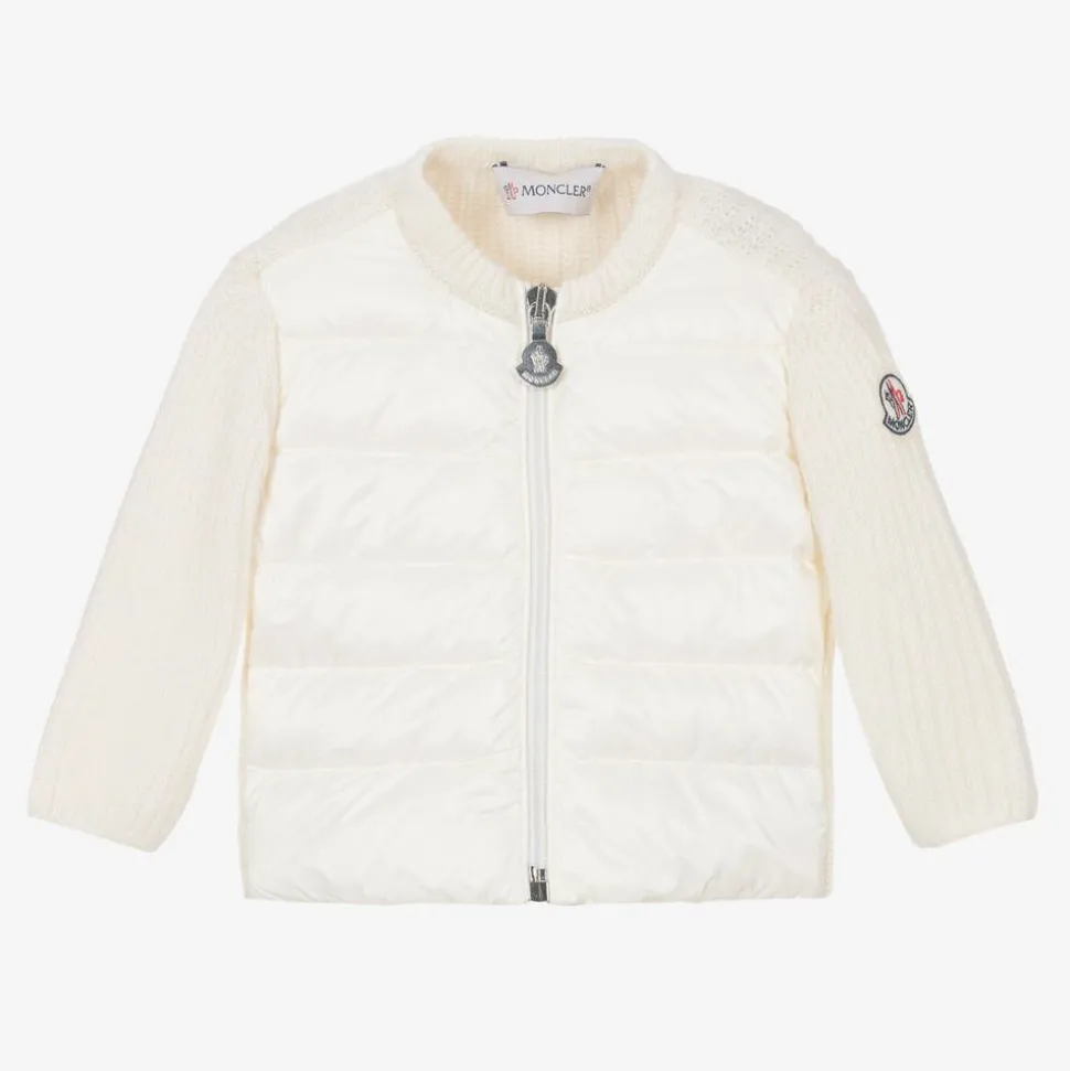 Cosy for little girls, this ivory Moncler Enfant cardigan is knitted in soft virgin wool with a stylish down-padded front. In a lovely rib pattern, this crew neck style has a silky smooth front and fastens with a zip and branded pull. For a signature designer finish, the luxury brand's felt logo patch can be seen on one sleeve.