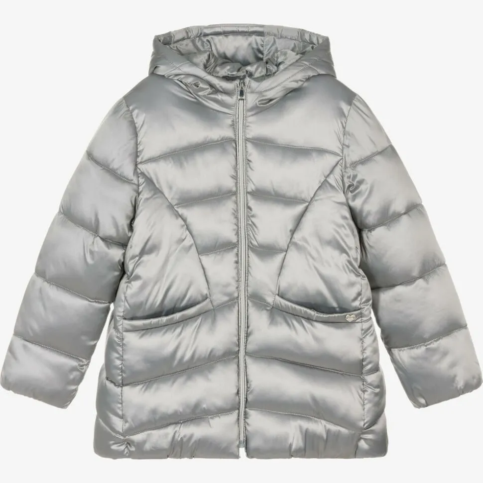 A metallic silver puffer coat for girls by Mayoral, made from a silky smooth fabric. This hooded coat has a zip fastening, pockets and a super soft fleece lining, great for keeping warm on cold-weather days.