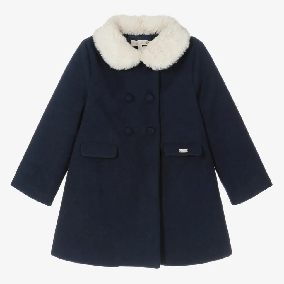 A lovely navy blue coat for younger girls by Pureté Du… Bébé, made in beautifully soft fabric with a felted feel. Lined in silky satin, this traditionally-styled coat has double-breasted button fastenings and a collared neckline. There are two decorative pockets on the front, one of which is branded with a pearlescent logo charm. For a different look, the coat comes with a detachable faux fur collar which attaches to the neckline with elasticated loops and hidden buttons.