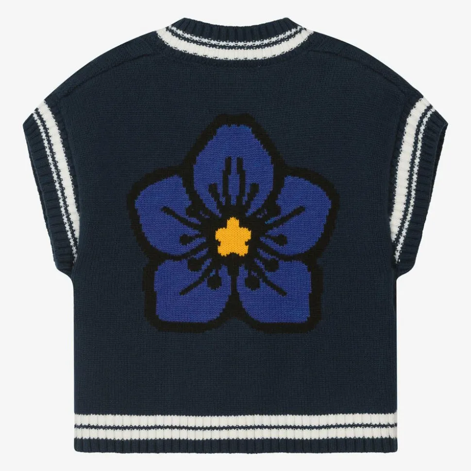 Laid-back and preppy, this navy blue slipover for girls is by KENZO KIDS. Knitted with a blend of cotton, viscose, and wool, it has cable knit details on the front and a bright yellow logo patch on the chest. There is a striking blue jacquard flower design on the back with a contrasting yellow centre for a bold look. The ivory stripes on the V-neckline, the hemline, and the dropped-shoulder armholes add to the collegiate style.