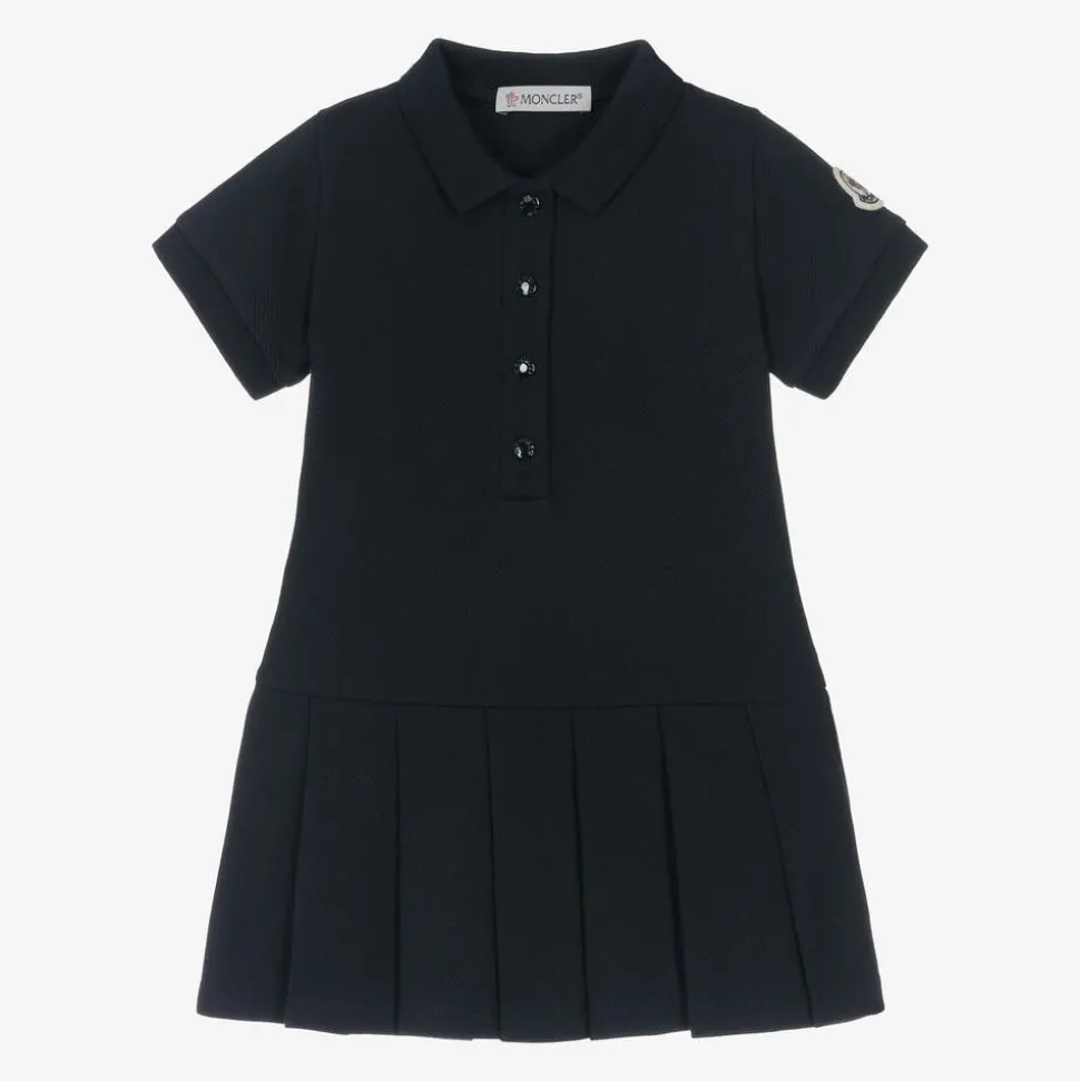 A navy blue pleated polo dress for younger girls by luxury designer Moncler Enfant. It fastens with easy-to-use, logo embossed poppers on the front. So soft and comfortable in cotton piqué, this short-sleeved dress is signed with the iconic felt patch stitched on one sleeve.