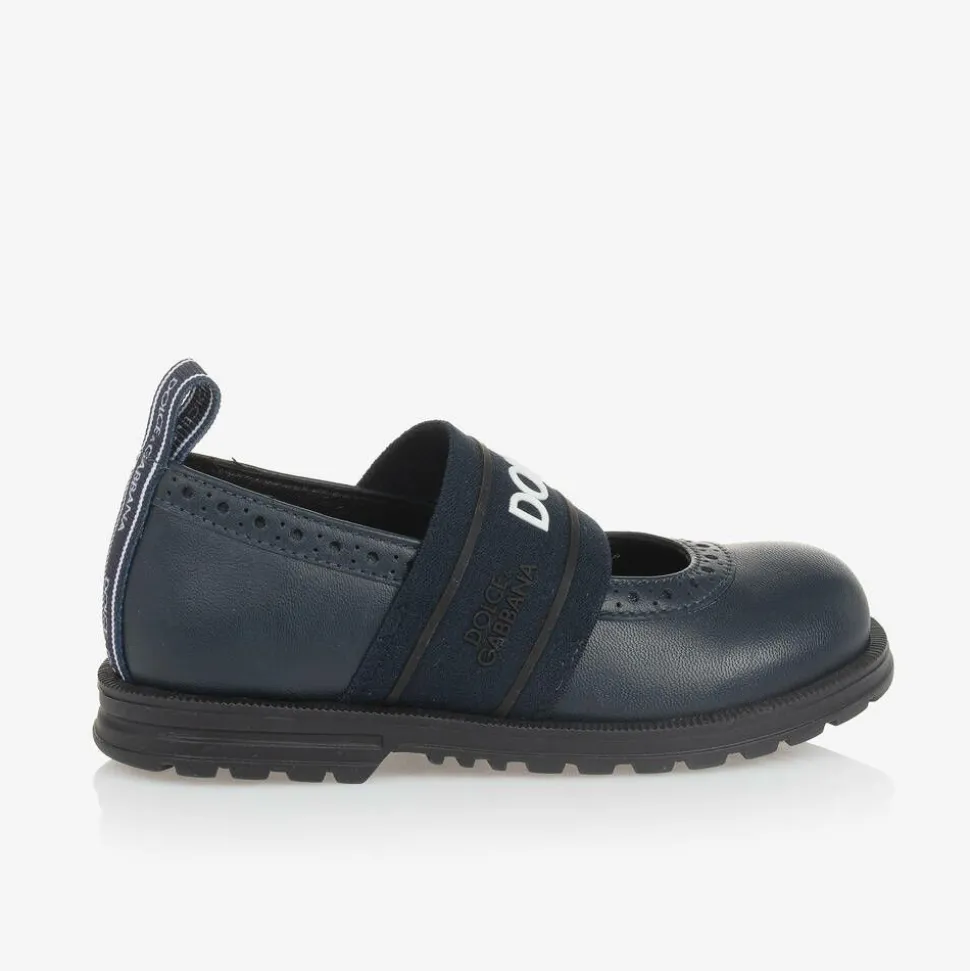 Navy blue shoes for girls by luxury Italian label Dolce & Gabbana, made in smooth, supple leather. Comfortable and easy to wear, these stylish shoes have an elasticated foot strap with a bold, raised white logo for a distinctive look. There is a pretty, decorative pattern around the top, with a branded trim on the heel pull tab adding an extra designer detail. Lined in smooth leather, they have a lightly cushioned insole for comfort and a non-slip rubber outer sole with deep treads providing good grip.