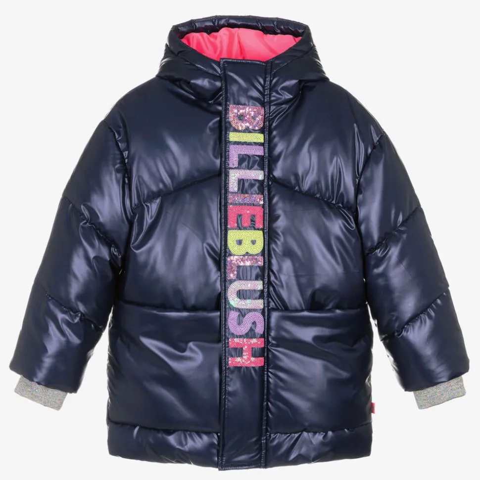 Navy blue puffer coat for girls by Billieblush, made in silky smooth and durable fabric with a shiny finish. Instantly recognisable, this warm layer has the designer's name on the front in multicoloured sequins and glittery ribbed cuffs for a girly touch. Padded for extra warmth, the full zip fastening and easy popper closures are both neatly concealed. As well as deep front pockets, the generous hood is lined with neon pink fabric and provides good coverage in the wet weather.
