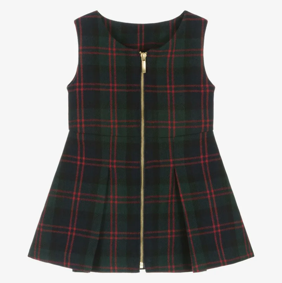 Smart navy blue, green and red tartan dress for girls by Lapin House, made in a soft wool blend. Ideal for layering, this stylish, sleeveless design has a flared skirt with inverted pleats on the front. It is fully lined in lightweight cotton and fastens with an exposed gold zip on the front for an elegant finish.
