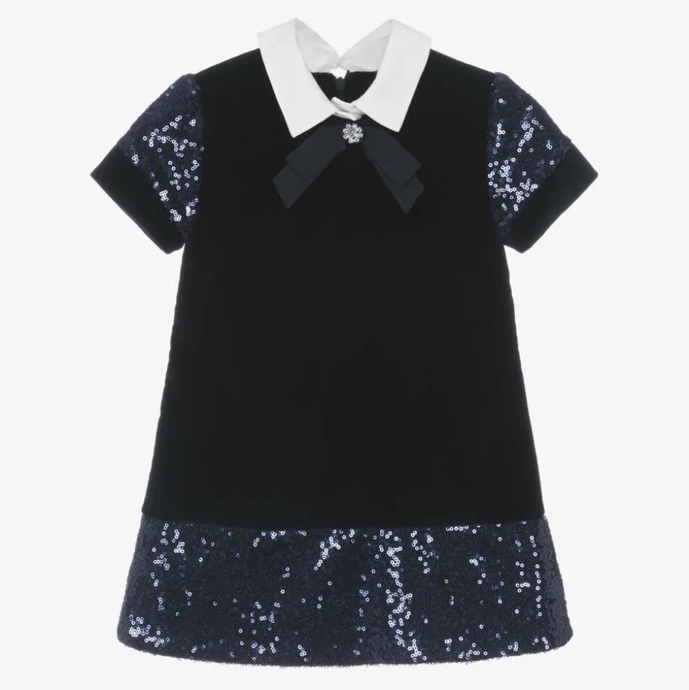 Navy blue velvet dress for girls from Lapin House, trimmed with sequins that shimmer beautifully in the light. Lovely for a special occasion, this smart dress has a contrasting white, twill collar and a grosgrain bow and crystal embellishment on the neckline. It is fully lined in lightweight cotton for comfort and fastens neatly on the back with a concealed zip and single button.