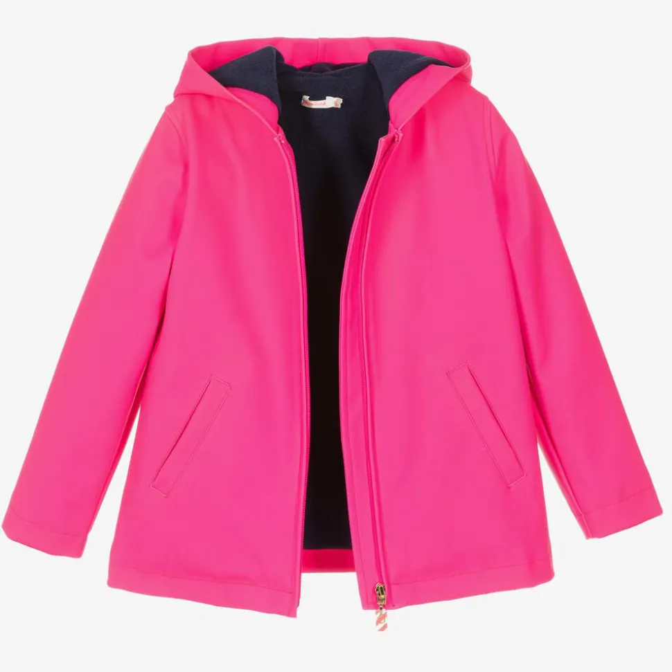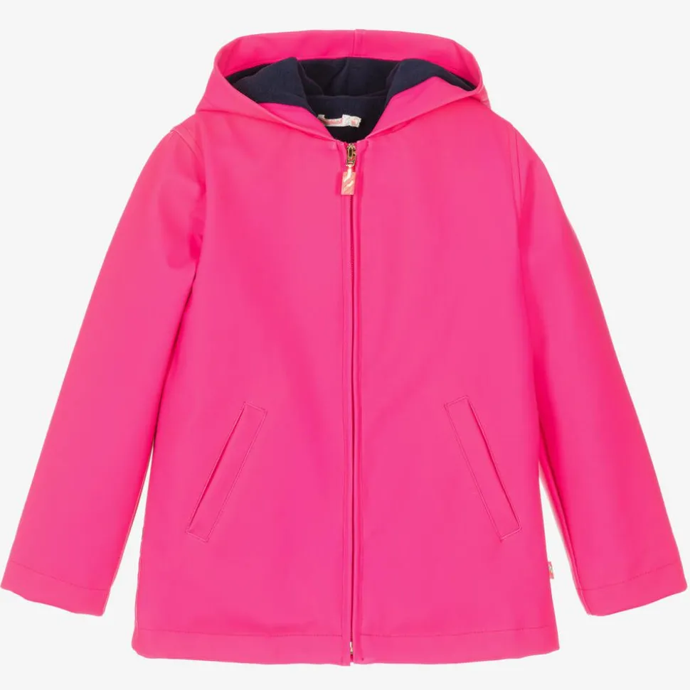 Neon pink hooded raincoat for girls by Billieblush. This cute water-resistant raincoat has an eye-catching, colourful dotted smiling face and logo print on the back. It is lined in breathable, navy blue microfibre fleece. It has a convenient zip fastening, with slanted pockets on the front, and the brand's signature logo tab on the side seam for a subtle designer touch.