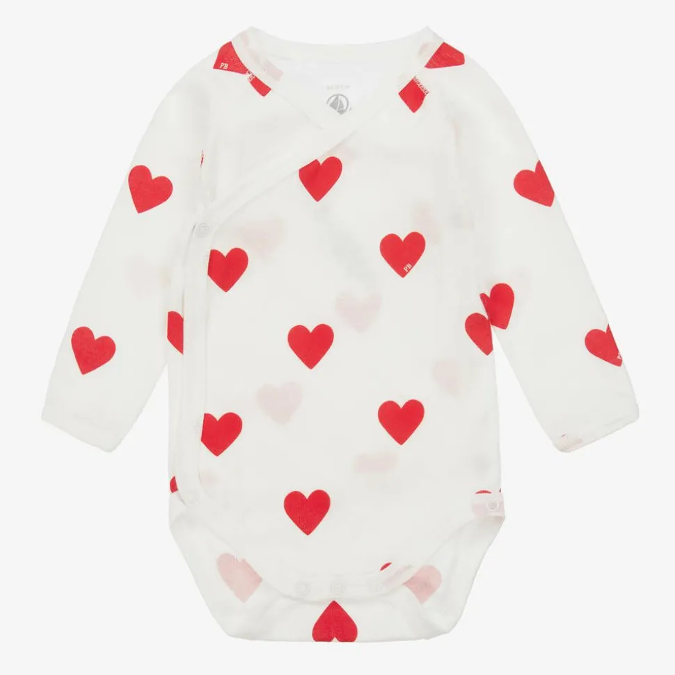 Pack of three ivory long-sleeved cotton bodyvests for baby girls by Petit Bateau. Made from super soft organic cotton jersey, they have practical wrap-over styling with popper fastenings on the side and between the legs. One has a red logo on the front, one is patterned with large red hearts, and the other is patterned with tiny red hearts.