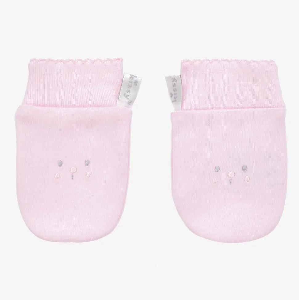 Sweet pale pink scratch mittens for baby girls by Kissy Kissy, made from soft Pima cotton jersey. Comfortable to wear, they have finely ribbed cuffs with lovely picot trims, and are embroidered with a cute teddy bear face on the front.