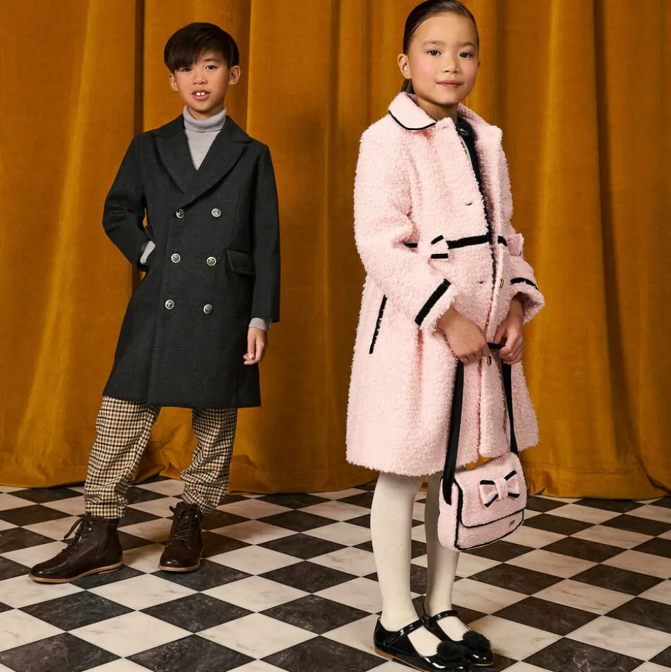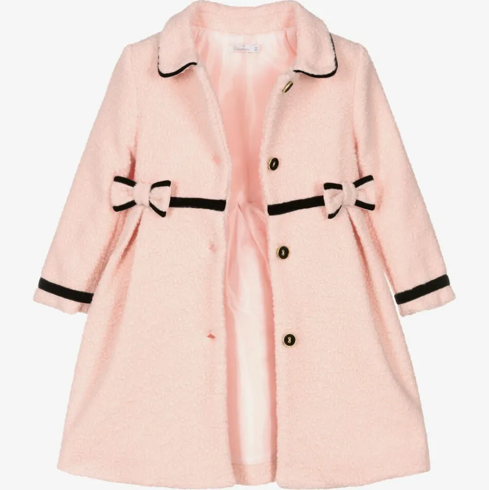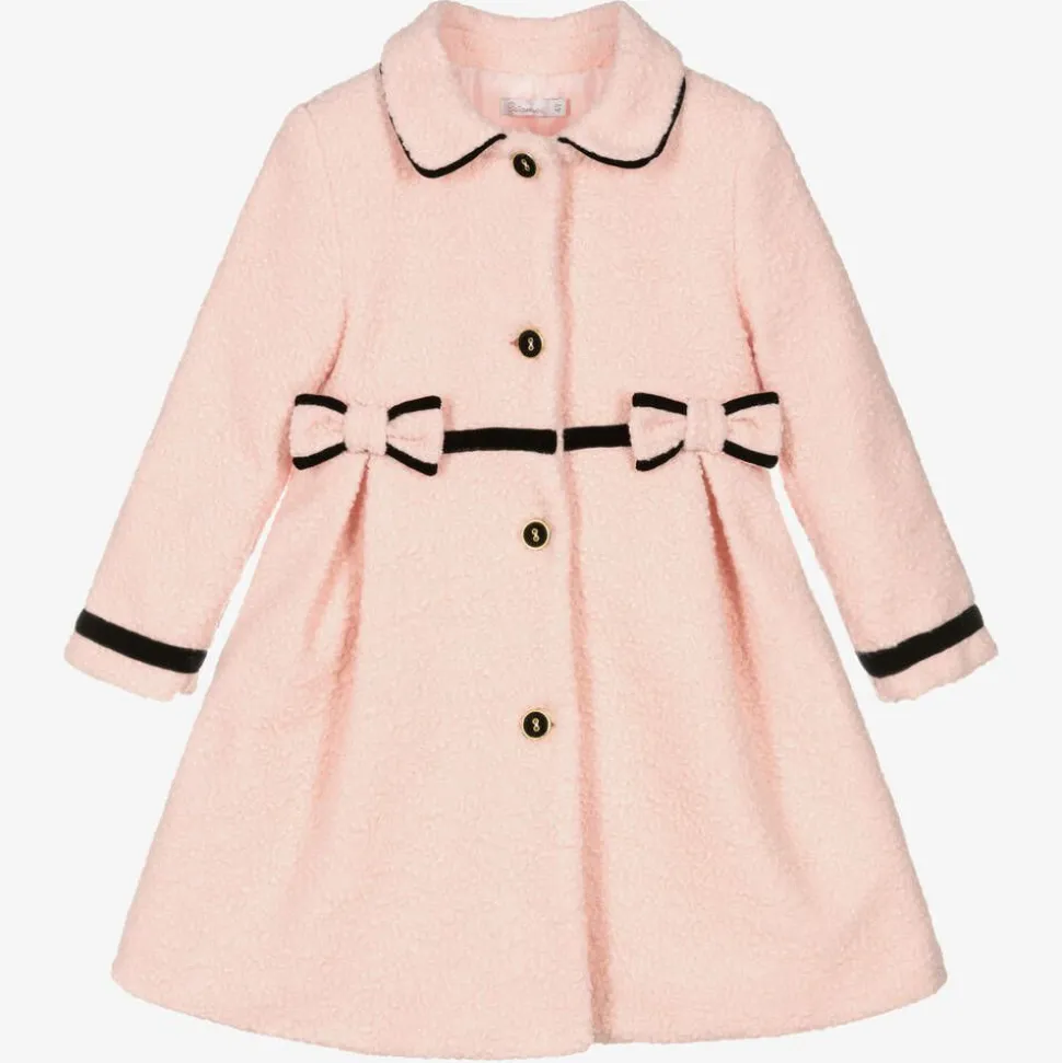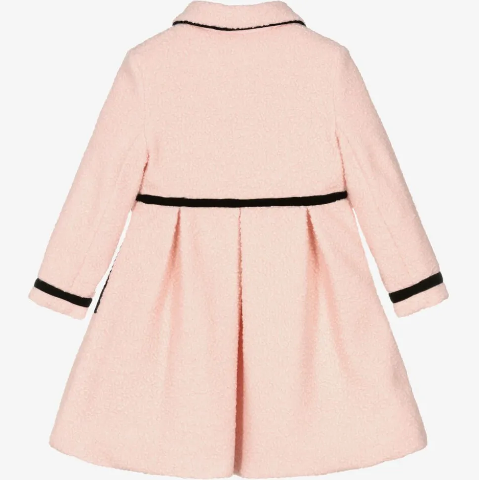 A pale pink coat for girls from Portuguese brand Patachou. With smart vintage styling, this soft bouclé coat is designed with black velvet trims, a rounded collar, and gold-tone metal button fastenings on the front. Gathered and pleated for shape, it has sweet decorative bows stitched on the front and useful side pockets. It is lined with pink satin to complete the look.