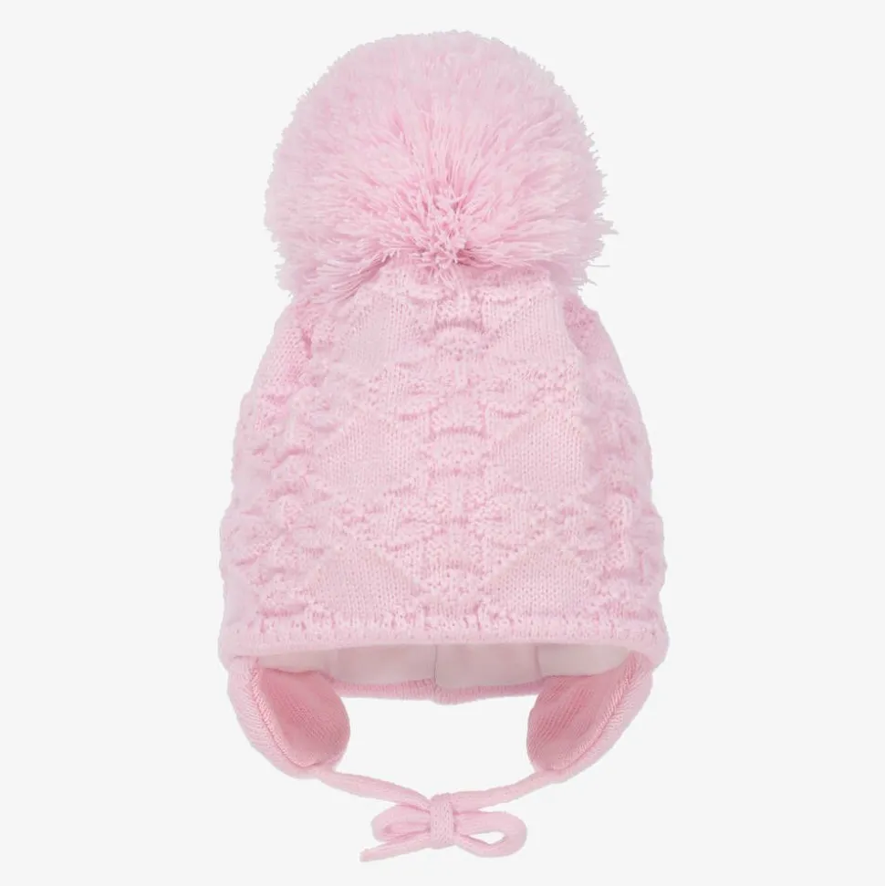 Sweet and adorable, this pale pink winter hat for little girls is by Sätila of Sweden. Lined in soft cotton jersey, it is knitted in a raised diamond pattern and has a giant pom-pom on the top. For extra warmth and comfort, it has little ear flaps and ties that fasten under the chin.