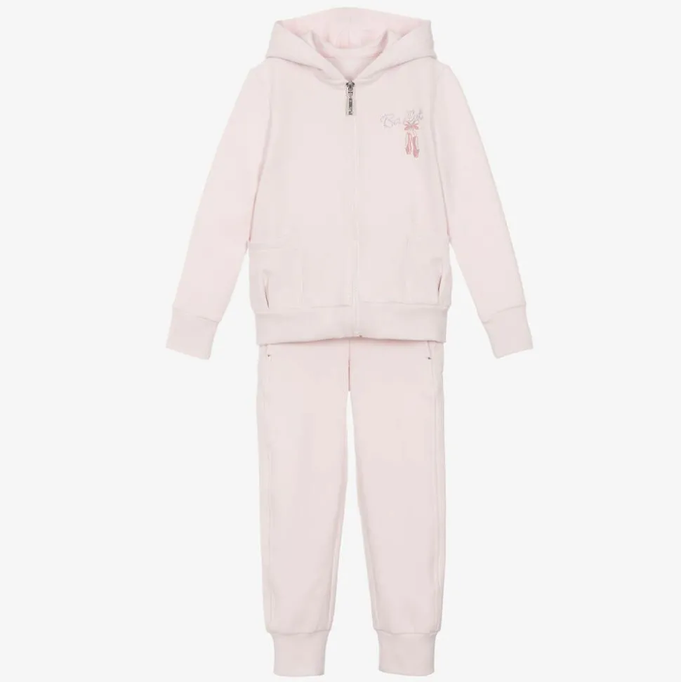 Pale pink cotton tracksuit for girls by Lapin House. The zip-up hoodie has the word 'Ballet' sparkling in diamantés on the front, with ballet shoes in contrasting pink. The joggers have coordinating diamantés trimming the useful side seam pockets. The tracksuit is made in soft, comfortable jersey, with a brushed inside.