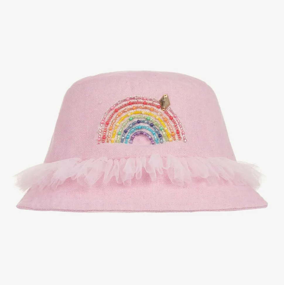 Fun pale pink bucket hat for girls by Tutu du Monde, with a beaded rainbow on one side and a tulle trim all around. It is made in mid-weight cotton twill and has a voile lining for comfort.