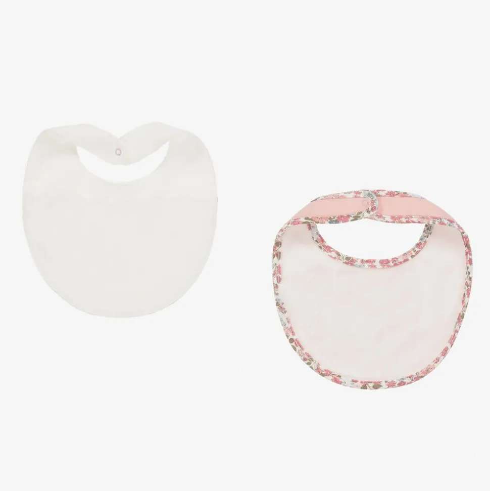 Pack of two super cute ivory and pink floral cotton bibs for baby girls by Mayoral. One has pink scalloped embroidery and a velvet bow whilst the other one has or a furry sheep appliqué on the front. Ideal for catching those little spills, they are made in soft jersey with a waterproof insert between the lining, and fasten with a popper on the back.