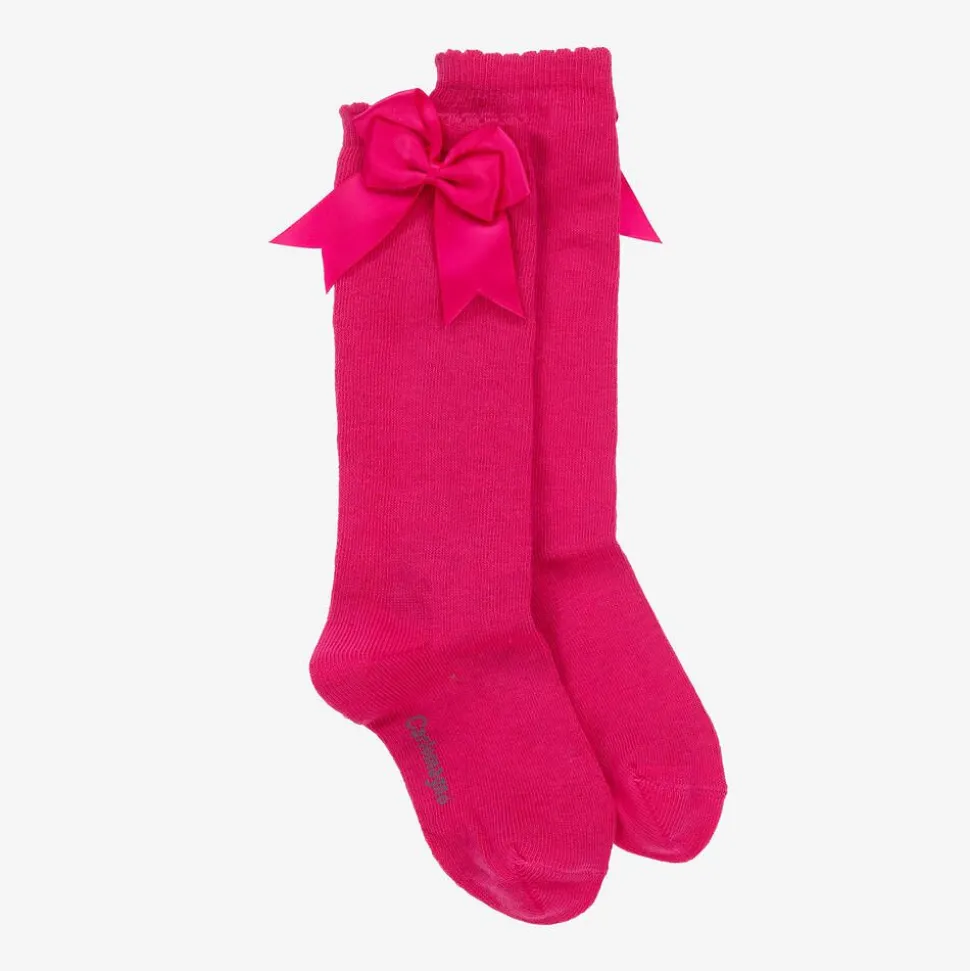 From traditional Spanish designer, Carlomagno these pretty fuchsia pink knee-high socks for girls are made from a soft cotton blend. They have a lovely satin ribbon at the side and an elasticated top for a comfortable fit.