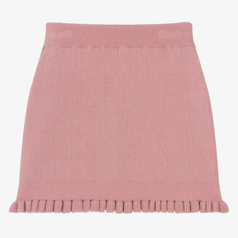 A gorgeous rose pink skirt for girls by Angel's Face, made in a soft, ribbed cotton knit with plenty of stretch. This slim-fitting skirt has an elasticated waistband detailed with a grosgrain bow and gold heart charm. It has a knitted frilled hem, a simple finish that creates a rippled edge.