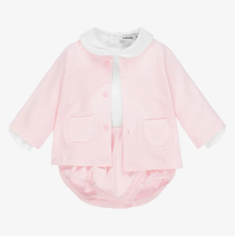 Pink and white three-piece shorts set for baby girls by Babidu. The set includes a waffle weave jacket, matching shorts and a white cotton top. The jacket has button fastening and the shirt fastens on the back with poppers. The shorts have an elasticated waist and leg holes.