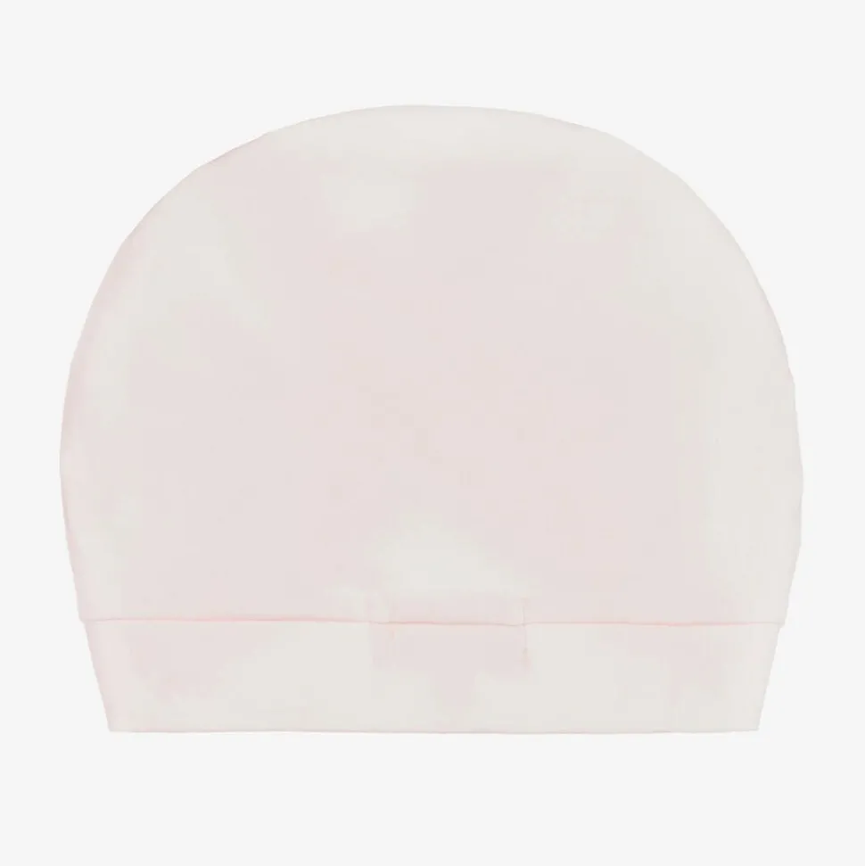 A stylish, pale pink turban style hat for younger girls by Caramelo Kids. Comfortable and stretchy, it is made in soft cotton jersey with a white logo tab on the rim. The front has a large, softly padded bow with sparkly beads.