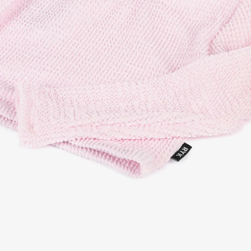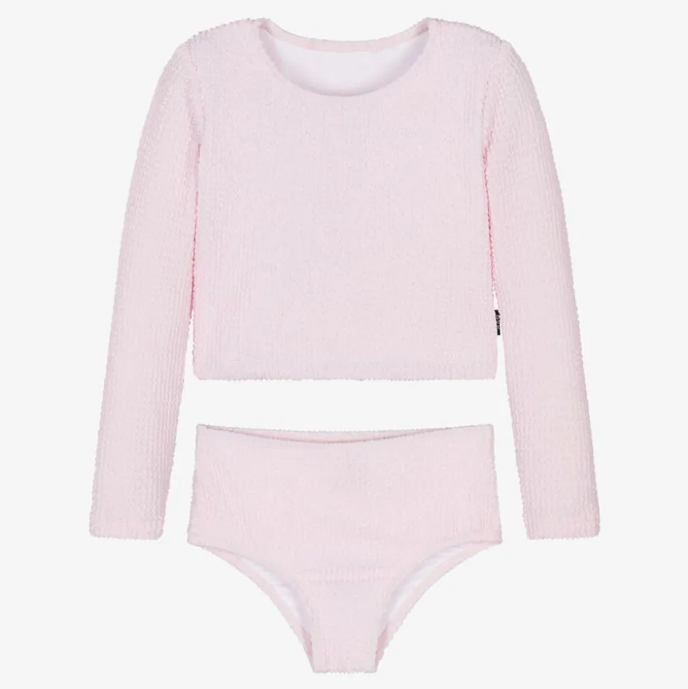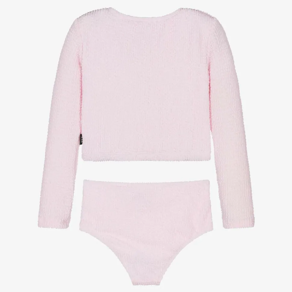 A lovely pale pink tankini for girls by Rock Your Baby, made in a stretchy, crinkle-textured fabric. Lined for comfort, the long-sleeved top has a rounded neckline and the bikini bottoms are gently elasticated for a comfortable fit.