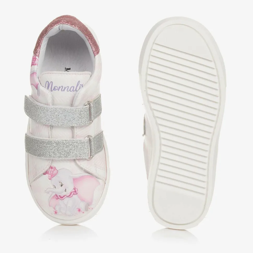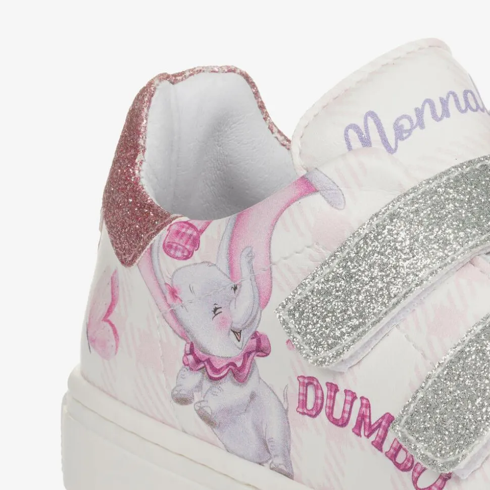 Delightful pink and white trainers for girls by Monnalisa. Made from smooth faux leather, they are printed with a pale pink check pattern and feature Disney's iconic Dumbo character for a fun look. They fasten with silver glittery velcro straps on the front and have pink sparkly panels on the heels. Lined in soft leather with lightly padded insoles and non-slip rubber outsoles, they have logo details on the tongues for a branded finish.