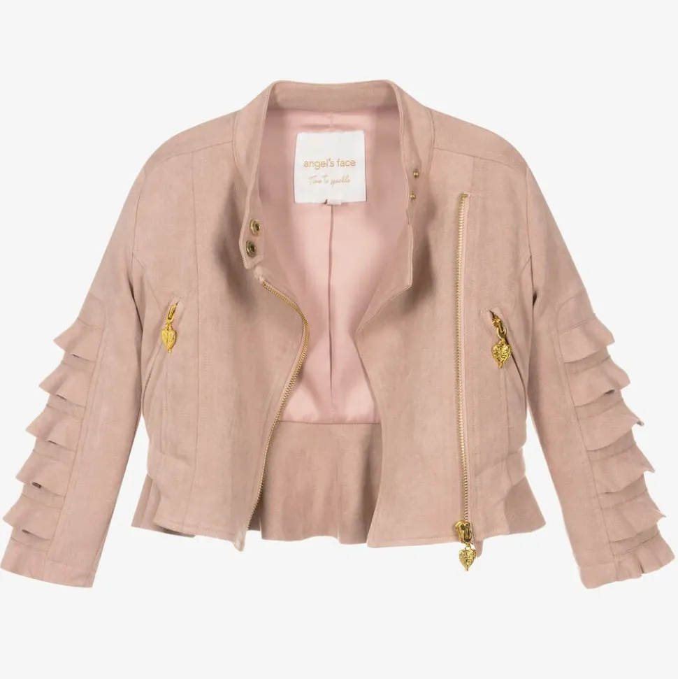 Dusky pink biker jacket for girls by British brand Angel's Face, made in super soft faux suede. It has gold and crystal logo popper fastenings on the neck for an edgy, yet glamorous look. It has shiny gold zip fastenings on the front and pockets that have the designer's signature gold heart charm pull tabs. Lined in luxuriously soft satin, there are ruffle trims on the sleeves and hem for a feminine touch.