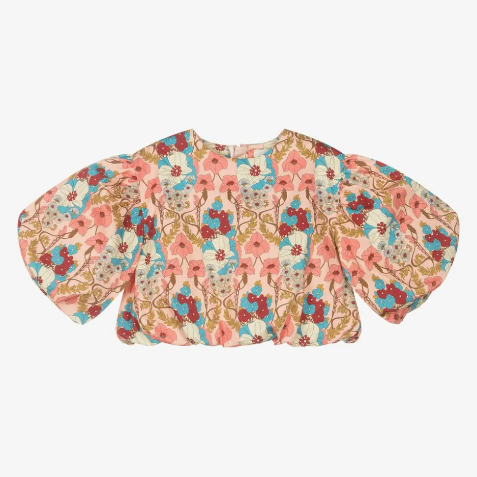 Coral pink blouse for girls by The Middle Daughter, patterned with 60's inspired florals. Woven in soft cotton sateen, this cropped-length top has statement puffed sleeves and a stylish bubble hem. It fastens with a concealed zip on the back and is lined in lightweight cotton for comfort.
