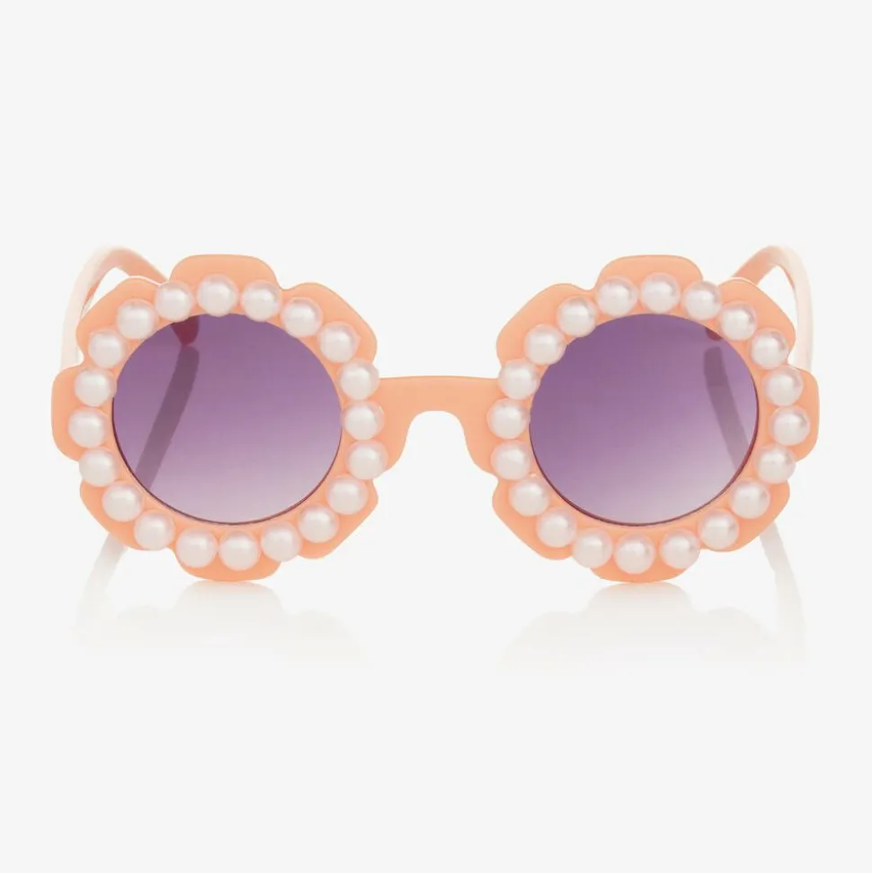 Adorable pink sunglasses for girls by Angel's Face, in the shape of a cute flower. Trimmed with white pearls, this cute sun accessory it ideal for elevating a look with playful charm. Complete with UV400 protection, they have purple gradient lenses and are finished with gold logo prints on the arms.