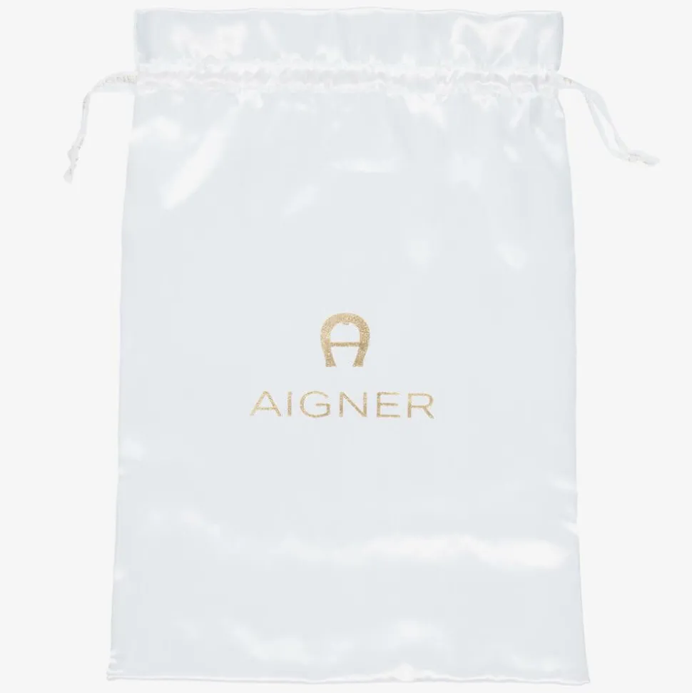 A pale pink babysuit set for girls by AIGNER, made from soft Pima cotton jersey with a gold branded pattern. Both pieces are embroidered with metallic gold signature 'A' horseshoe logos and coordinating details, for a distinct look. Fastening with poppers on the back and between the legs, the babygrow has a sweet ivory Peter Pan collar and a matching panel around the waist. A lovely layette hat with a pale pink turned-up brim completes this adorable look.