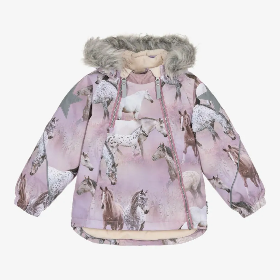 Lilac-pink ski jacket by Molo, with a whimsical horse design. Padded, with a cosy fleece lining, it has taped seams and a useful pocket on the front. The detachable hood has a removable faux fur trim, both secured with poppers. The jacket has a quarter and full zip on the front, with protective chin guards and a ribbed jersey neckline for comfort. The cuffs are gently elasticated and there are reflective stars and trim detailing for visibility. This item contains recycled materials.