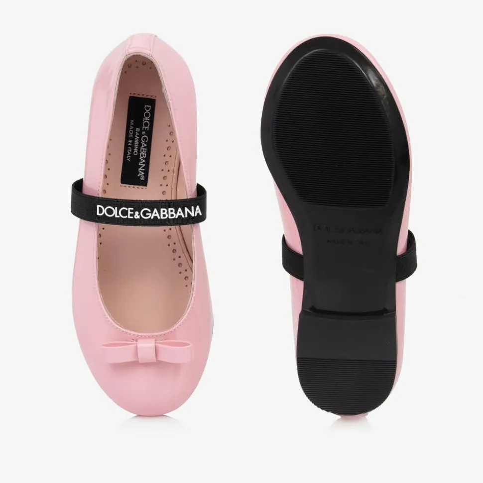 Chic, glossy pale pink patent leather ballerina flats for girls by luxury designer Dolce & Gabbana. For a smart casual styling, they have black elasticated straps with a white rubberised logo, adding a modern look and keeping the foot in place comfortably. This classic slip-on design has a pretty bow, a full leather lining and a lightly padded insole with lovely perforated detailing for a more refined finishing touch. The rubber outsole improves grip when walking.