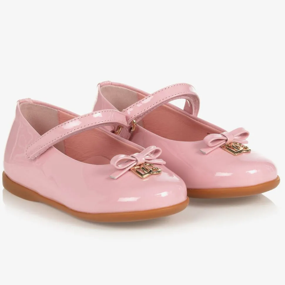 Pink patent leather ballerina pumps for little girls by luxury designer Dolce & Gabbana. Lovely for both special occasions and casual wear, they have sweet little bows and a golden DG logo on the toes. They fasten with a velcro strap over the foot and have reinforced heels for sturdiness, Fully lined in soft leather, they have a lightly padded insole for an extra luxurious feel. They have a brown non-slip rubber outer sole for good grip.