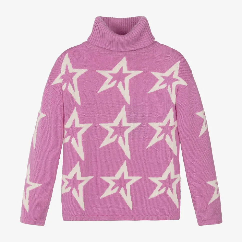 Candy pink Mini-me roll neck sweater for girls by Perfect Moment, knitted in luxuriously soft Merino wool. The designer's iconic symbol, the star, can be seen across the warm, cosy style for a branded vibe.
