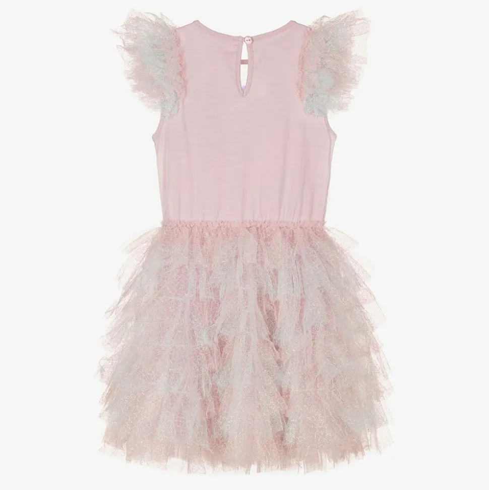 Beautiful pink unicorn costume dress for girls by Tutu du Monde, made in lightweight tulle with a soft cotton lining for comfort. The bodice is embellished with iridescent sequins and beads with intricate unicorn ears just below the neckline. The layered tulle skirt gives a waterfall effect of sparkling pink and blue to catch the eye. A single button fastening on the back secures the keyhole detail for a feminine finish. Items are made to last and become more lovely with wear as slight fading and fraying edges adds to their charm.