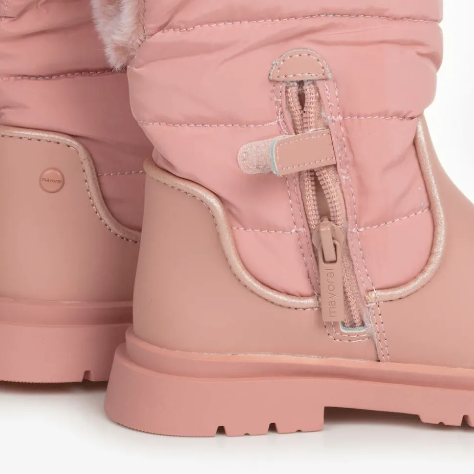 From Mayoral, pink leather snow boots for girls lined with super soft faux fur. Warm and cosy, these lovely boots can be folded down for an alternative look.