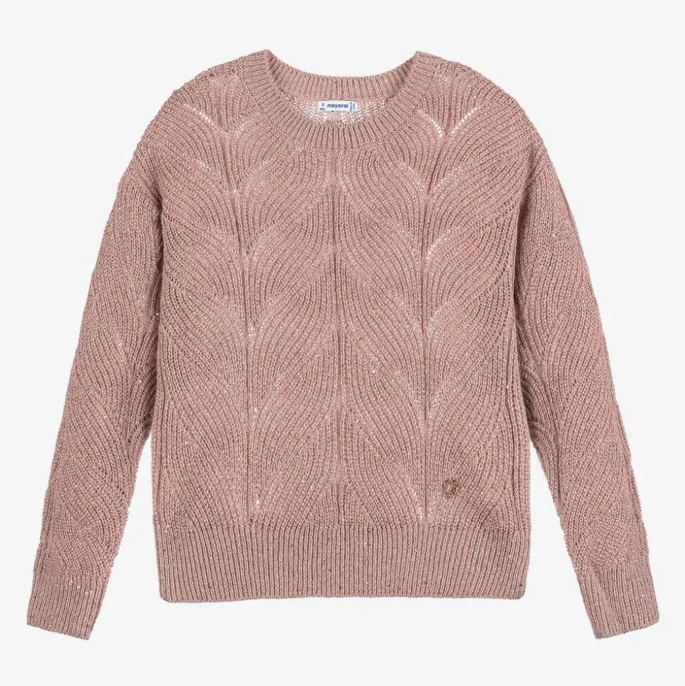 Lovely dusky pink sweater for older girls by Spanish brand Mayoral, made in a soft, lacy wool-blend knit. Woven with glittery gold thread and delicate sequins, this pretty top is casually styled with dropped shoulders and lightly ribbed trims. A gold heart-shaped logo charm can be seen on the front for designer appeal.