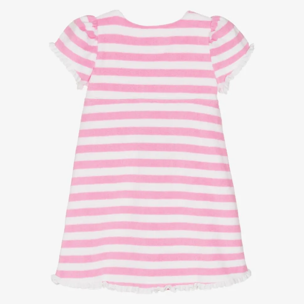 Girls pink and white striped cotton dress by Mitty James, exclusive to Childrensalon. Ideal for wearing on either the beach or pool, it is made in soft, absorbent towelling with a smooth reverse side. The pretty puffed sleeves and hemline have frilly white trims.