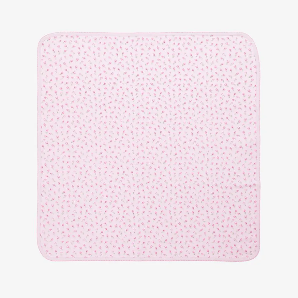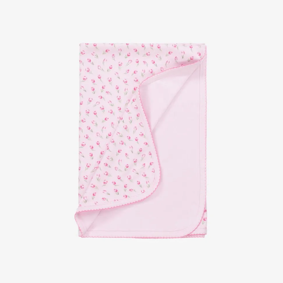 Pretty pink blanket for baby girls by Kissy Kissy, made in super soft Pima cotton jersey. With a delicate tulip print in shades of pink and green, this comfortable blanket has a plain reverse side and a sweet picot trim. A versatile nursery accessory, it can be used to wrap around baby or when out and about in the pram or car seat.
