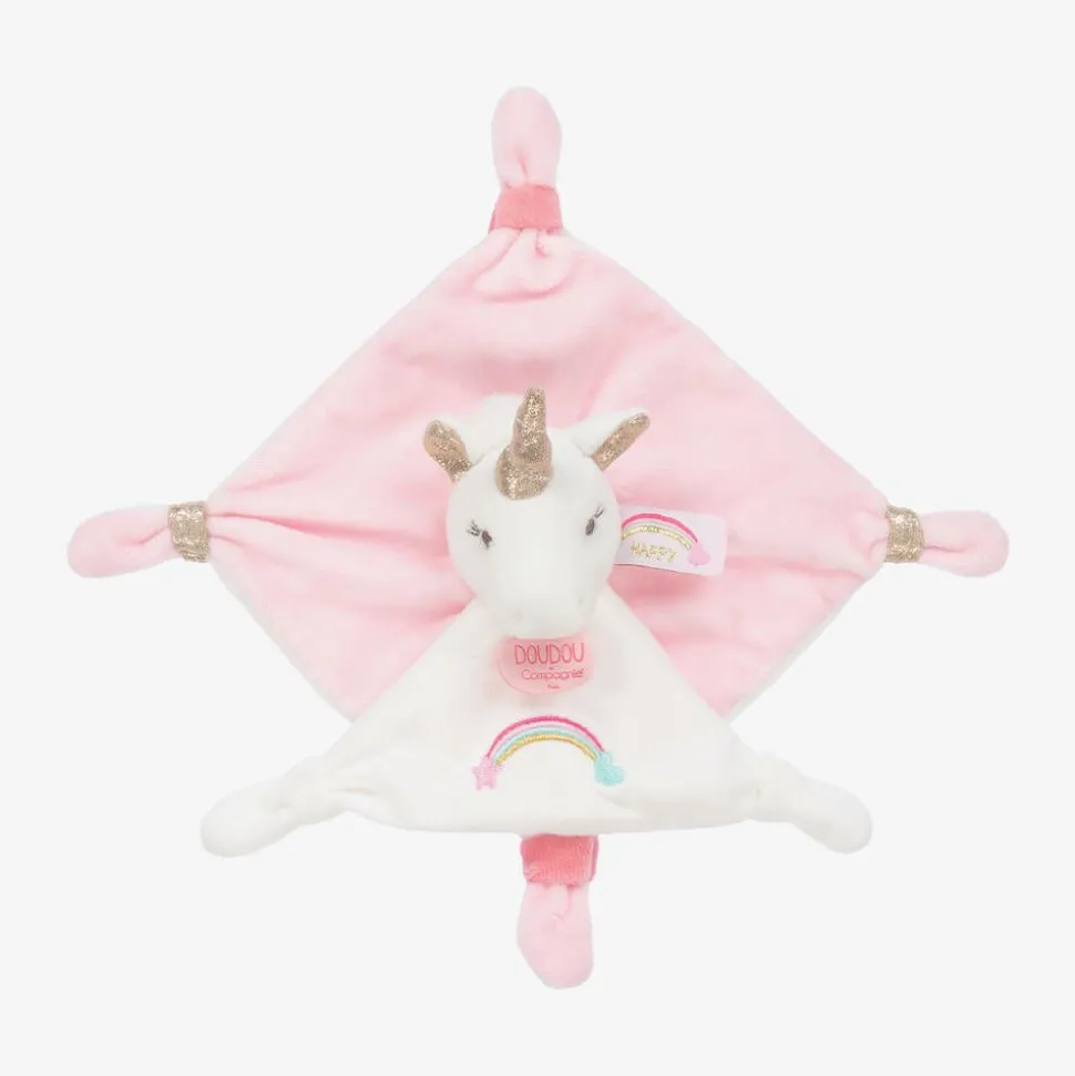 A white and pink unicorn comforter for baby girls by Doudou et Compagnie, made in super-soft velour with an embroidered rainbow design. Shimmering in the light, it has gold glitter trims to help stimulate baby's vision. The knotted corners are ideal for tiny hands to grip and explore.