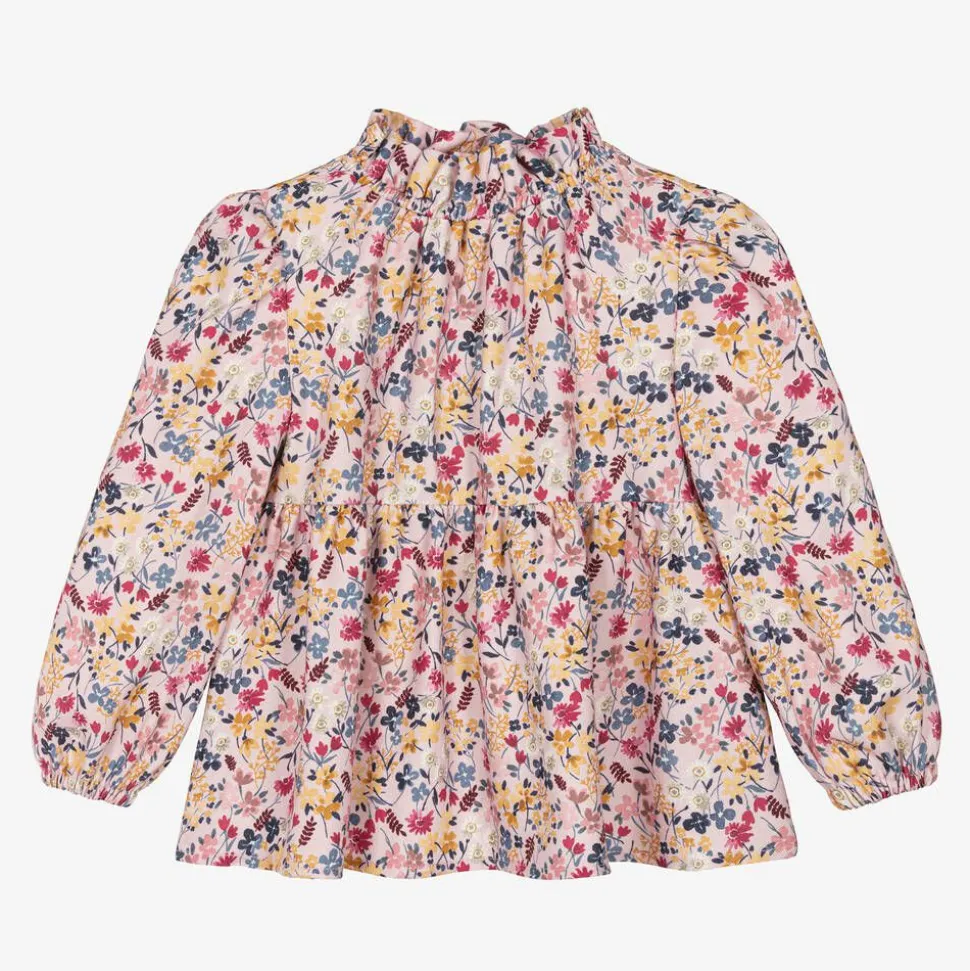 A pretty pink blouse for girls by luxury Italian brand Il Gufo, with a lovely floral pattern in pink, yellow and blue. Made in beautifully soft viscose blend twill, it is comfortably styled with a wide, gathered hem and stretchy cuffs on the puffed long sleeves. The high, frilled neckline is gently elasticated allowing it to slip easily over the head. For a subtle designer finish, a small logo tab is sewn on one side seam.