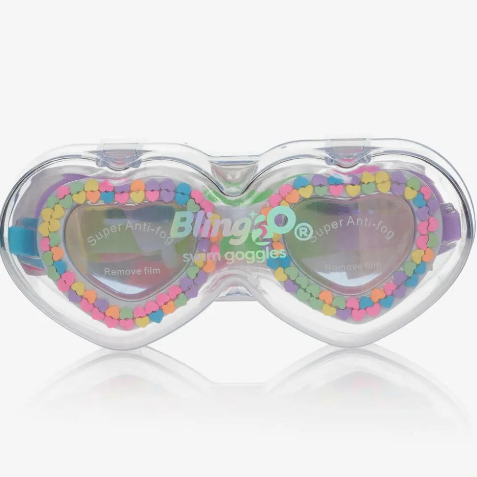 Super cute pink, purple and green swimming goggles for girls by Bling2o. Heart shaped, the reflective lenses are encrusted with colourful hearts. They are latex free, have an anti-fog coating and maximum UV protection. The wide adjustable strap has a back slider and the brand's logo on the back. They come in a hard protective case.