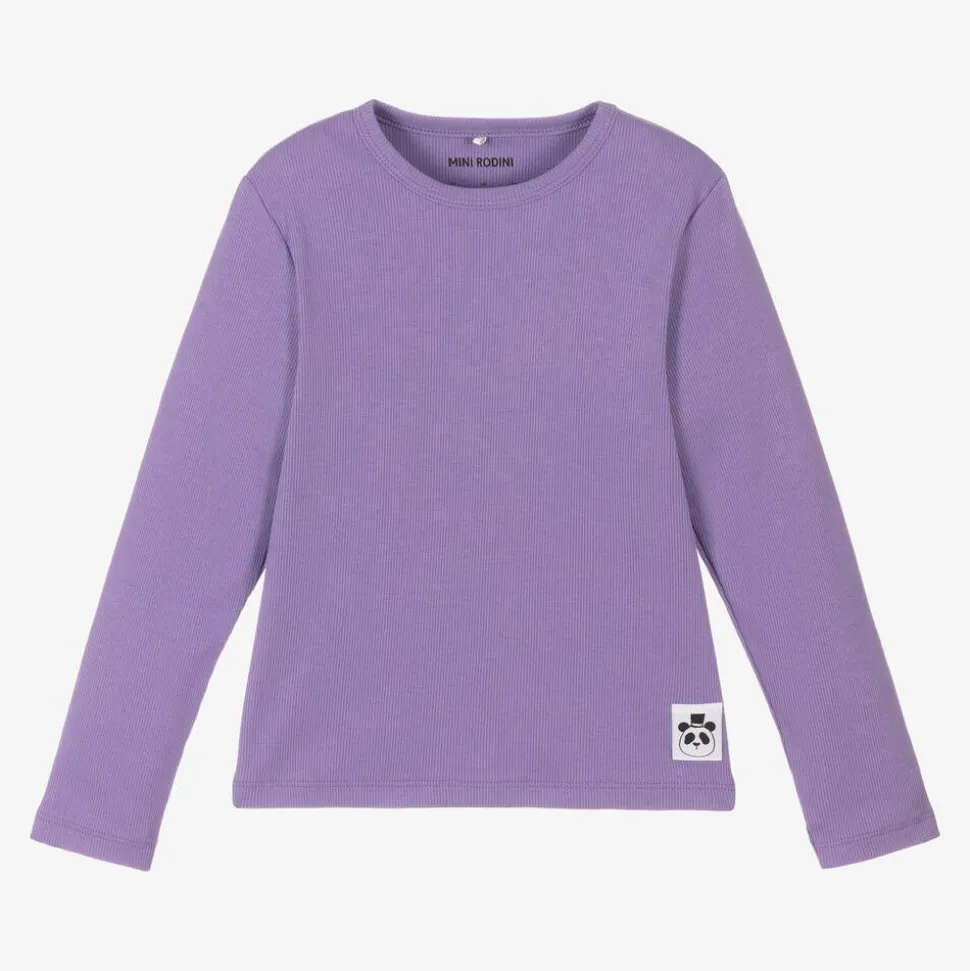 A purple, organic cotton long-sleeved top for girls is by Mini Rodini. This casual staple is made in soft and stretchy ribbed jersey for everyday comfort, with the brand's Panda patch on the front.