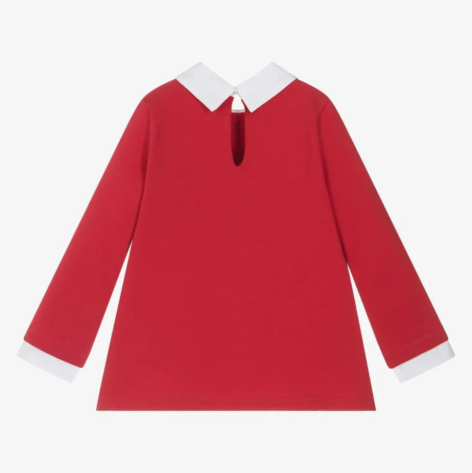 A lovely red long-sleeved top for girls by Balloon Chic, made in comfortable cotton jersey with a soft, fleecy inside. Designed with a contrasting white woven collar and cuffs, this pretty top has cute teddy bear prints on the front, trimmed with tartan ribbon bows. 'Sweet bears' is printed in glittery gold for added sparkle and for a neat finish, it fastens on the back with a single button.