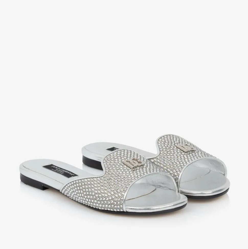 Gorgeous silver sliders for girls by luxury fashion house Dolce & Gabbana. Sophisticated and glamorous, the shaped and leather-trimmed satin foot strap is beautifully embellished with rhinestones which sparkle with every move and a silver-tone DG branding for designer appeal. They are comfortably lined in smooth leather, with a lightly cushioned insole and a sturdy Italian leather outsole with rubber pads providing good grip.