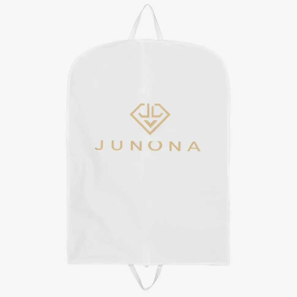 Stunning white dress for little girls by Junona, made in soft, lightweight chiffon embroidered with beautiful glittery gold flowers. Ideal for a special occasion or party, it has underlayers of soft organza and lightweight tulle for added volume and a cotton lining for comfort. This sleeveless dress has a removable, oversized silk organza bow on the back and a matching large collar, with a clear and gold crystal decoration on the front for a touch of sparkle. It fastens neatly on the back with a concealed zip.