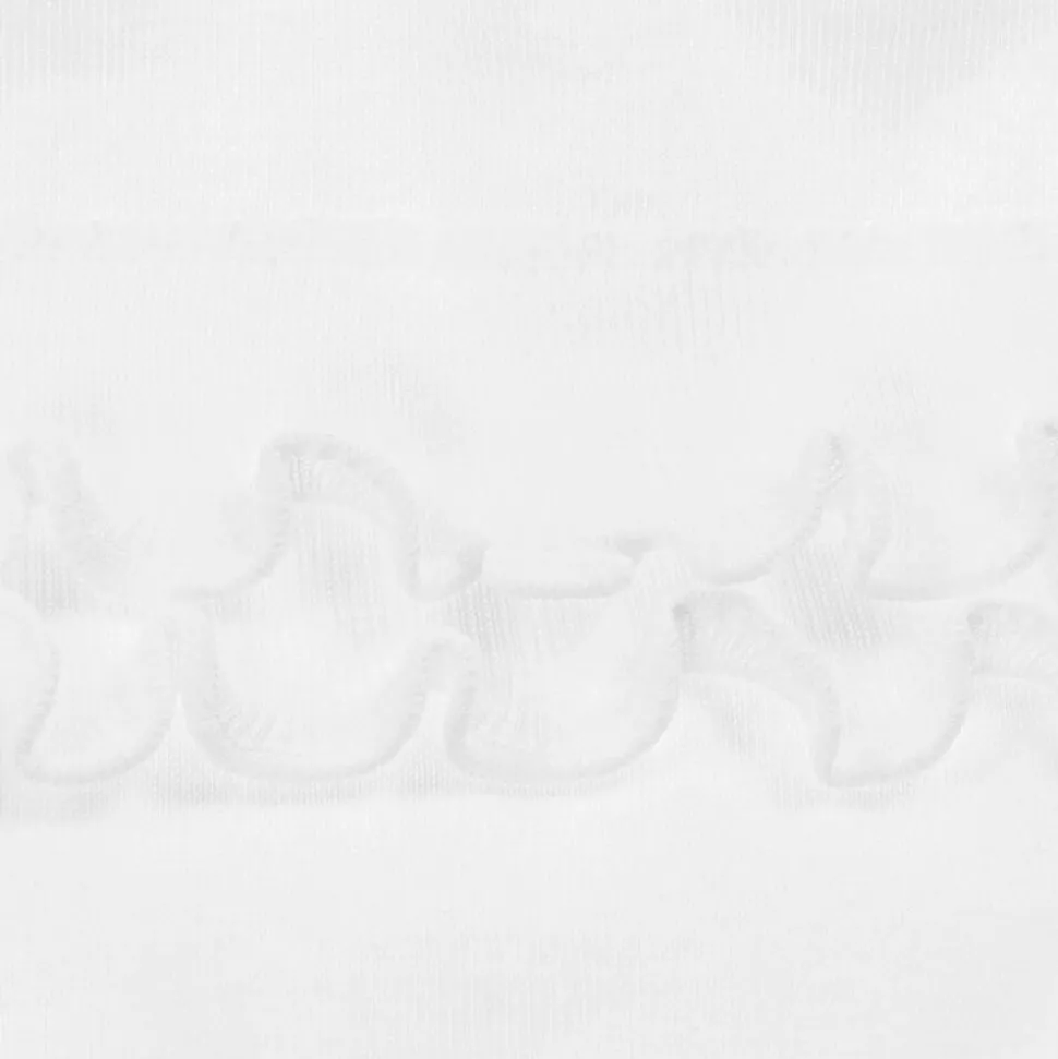 Little girls white frilly pants from Babidu. Made in super soft cotton jersey, they have an elasticated high-waist and a sweet fluted ruffle on the back.