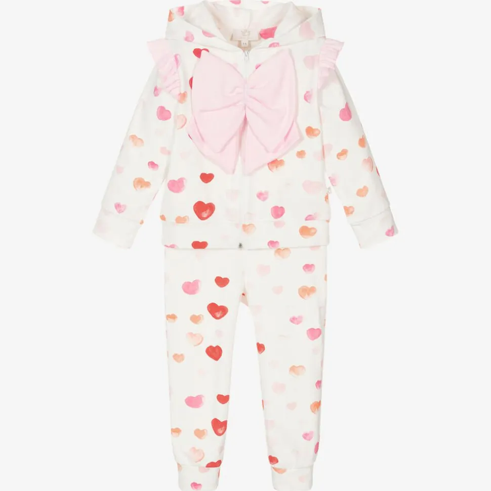Exclusive to Childrensalon, this off-white cotton tracksuit for girls by Caramelo Kids has a pretty red and pink heart pattern. The hooded zip-up top has an oversized, pink bow on the chest and charming frill details on the shoulders. The matching joggers have an elasticated waist and lightly ribbed cuffs for comfortable wear.
