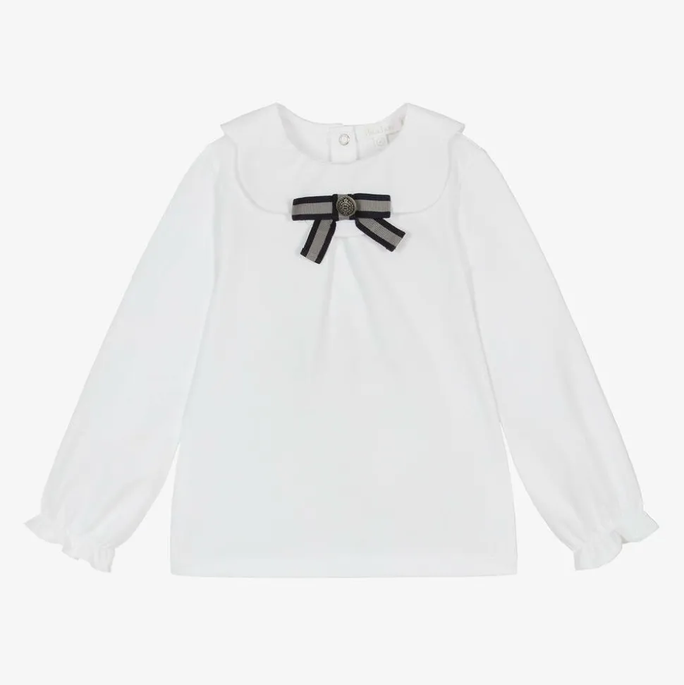 Combining comfort and style for girls, this white long-sleeved top is from Portuguese brand Patachou. Made in beautifully soft cotton jersey, it has a scalloped twill collar and a grosgrain ribbon bow in navy blue and grey on the front, with a decorative crest button. The long sleeves have gently elasticated, frilled cuffs and there are popper fastenings on the back.