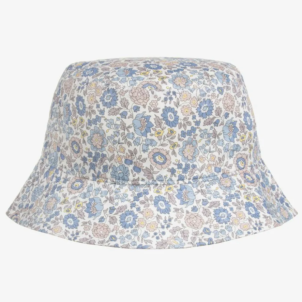 White bucket style sun hat for girls by Milledeux, made in soft, lightweight cotton. Patterned with a pretty blue and beige floral Liberty print, it is fully lined for comfort. Ideal for warm sunny days, it has a wide brim to shade the eyes from the sun.