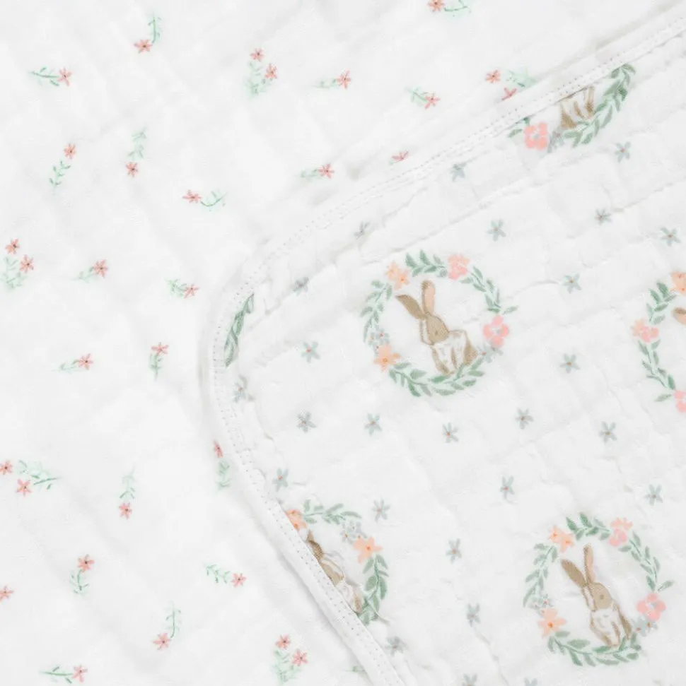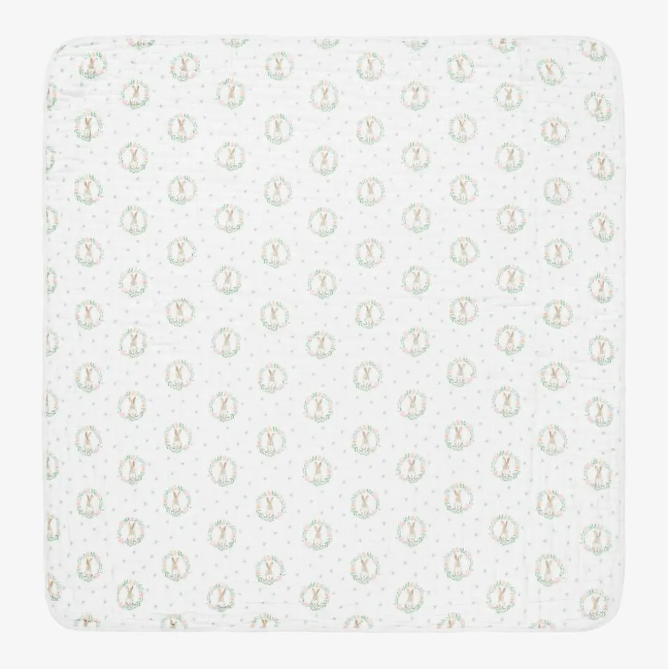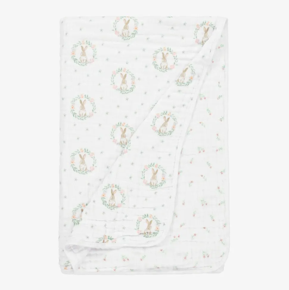 Lovely white muslin blanket for baby girls by aden + anais, woven in beautifully soft and lightweight cotton. One side is printed with cute bunnies and the other side has a pink flower print. Becoming softer with each wash, it is ideal for newborn tummy time and cuddles.